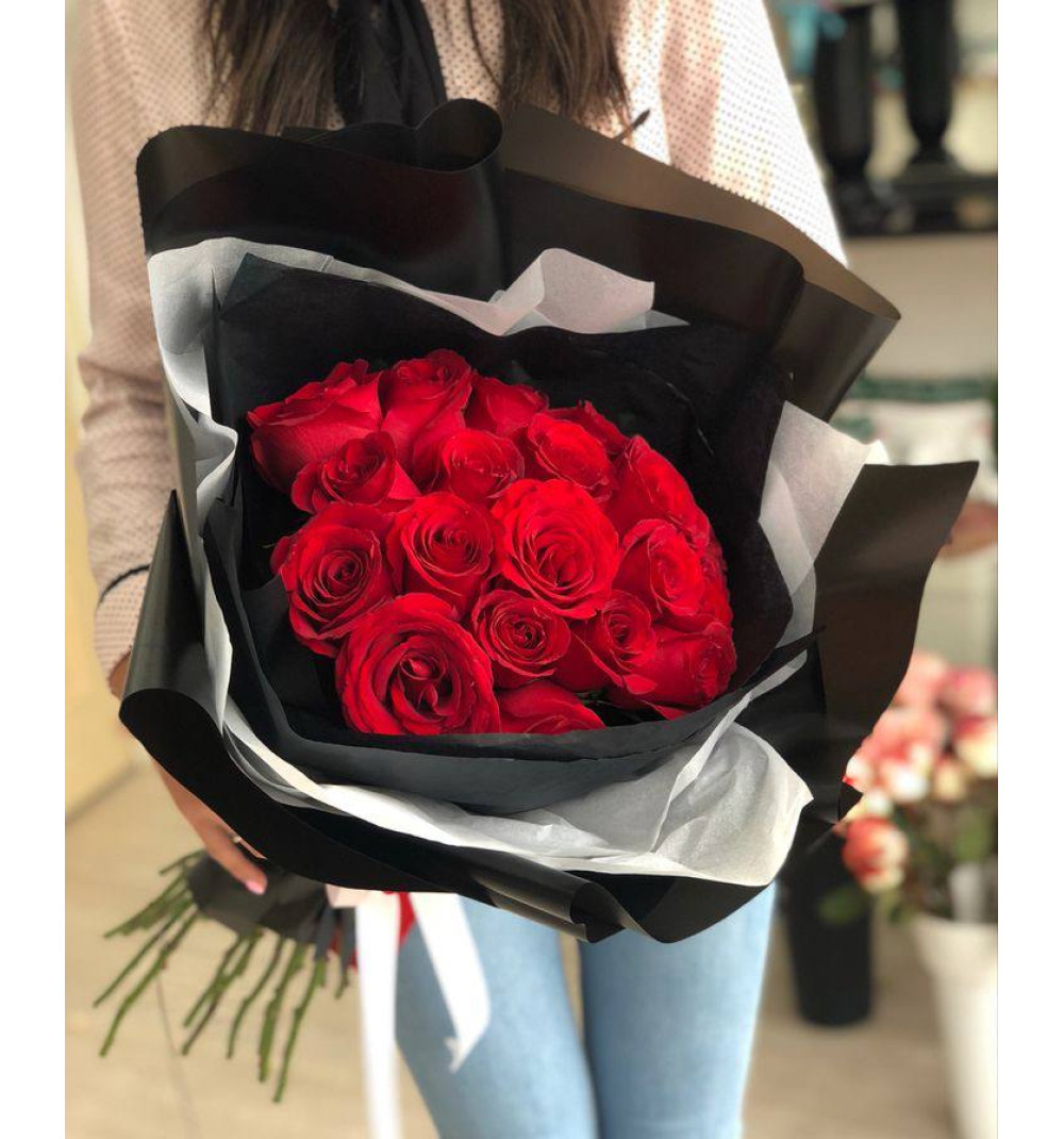 Букет из красных французских роз с эвкалиптом — это стильное и страстное сочетание. Глубокий бархатный оттенок роз подчёркивает изысканность композиции, а свежий аромат эвкалипта добавляет нотку утончённости.